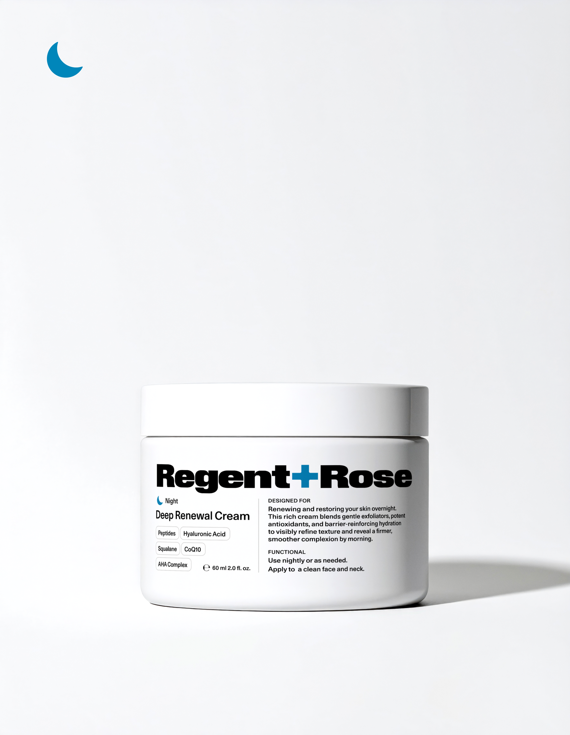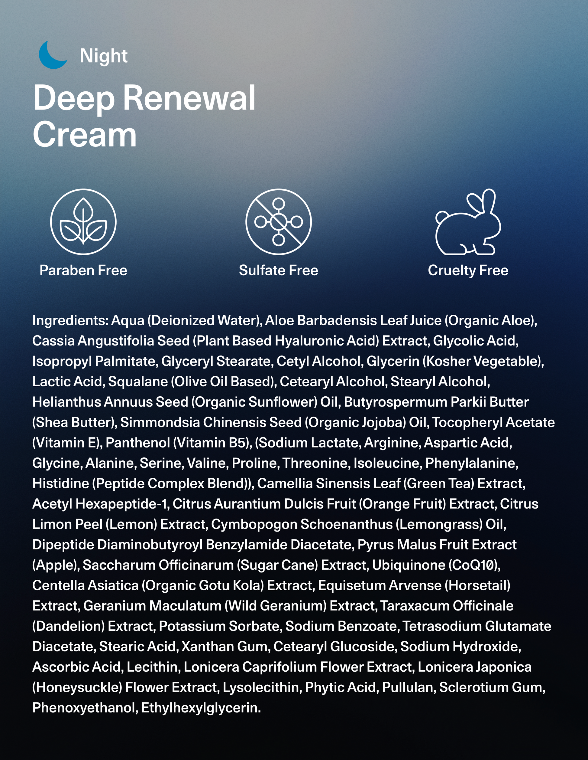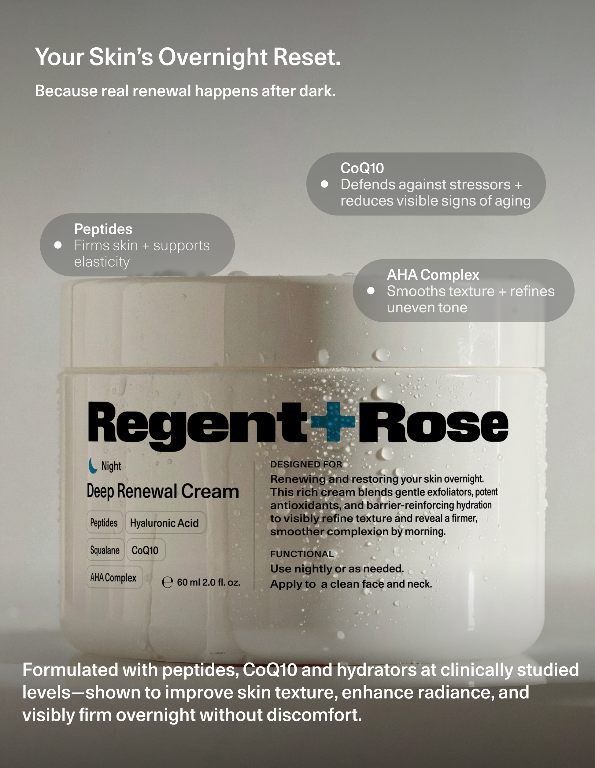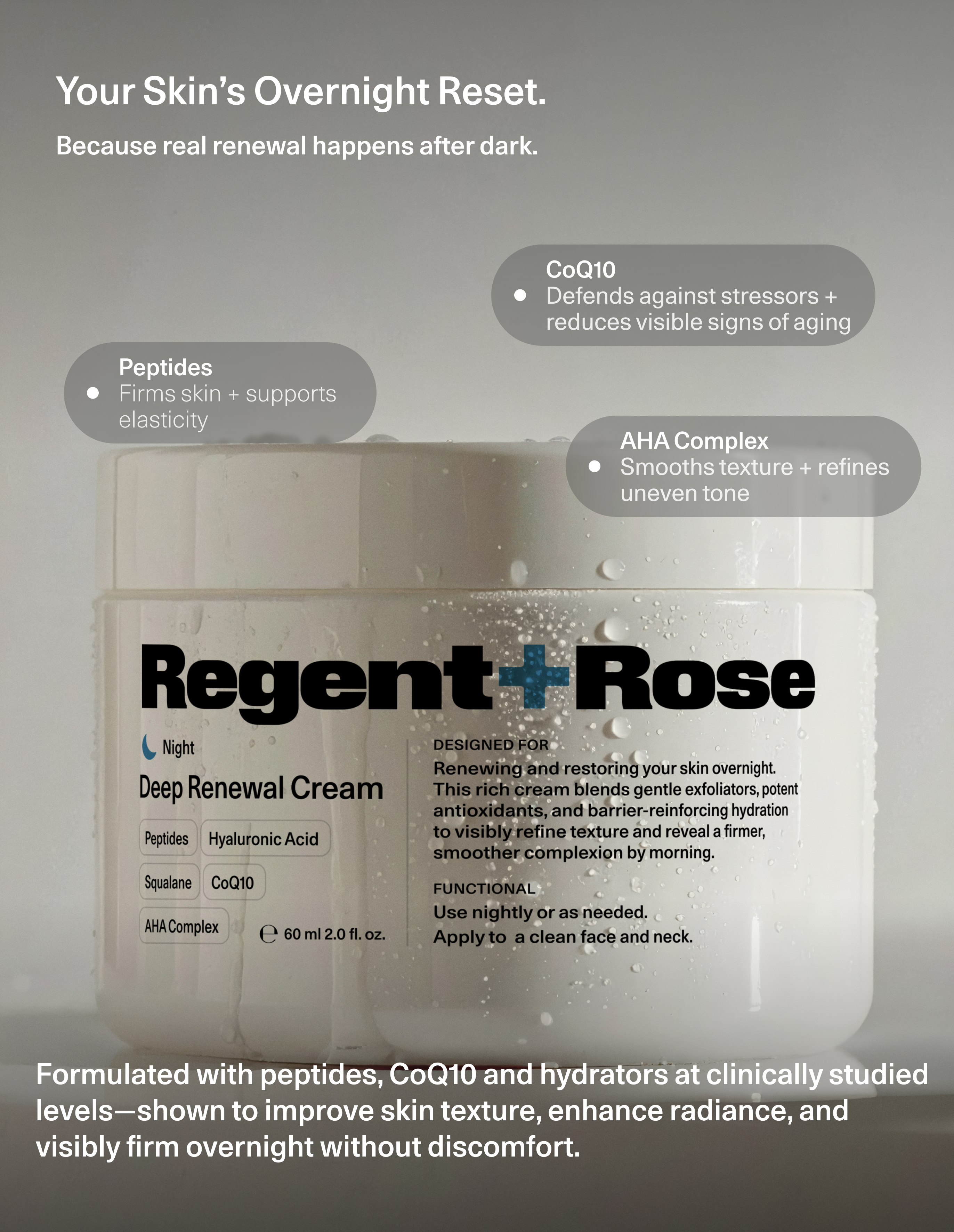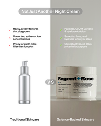 An indulgent overnight cream with a peptide complex, CoQ10, hyaluronic acid, and AHAs that deeply hydrates, refines, and restores radiance. Rich but breathable, this formula smooths the look of fine lines and texture while supporting overnight renewal—so skin feels firm, refreshed, and balanced by morning.
