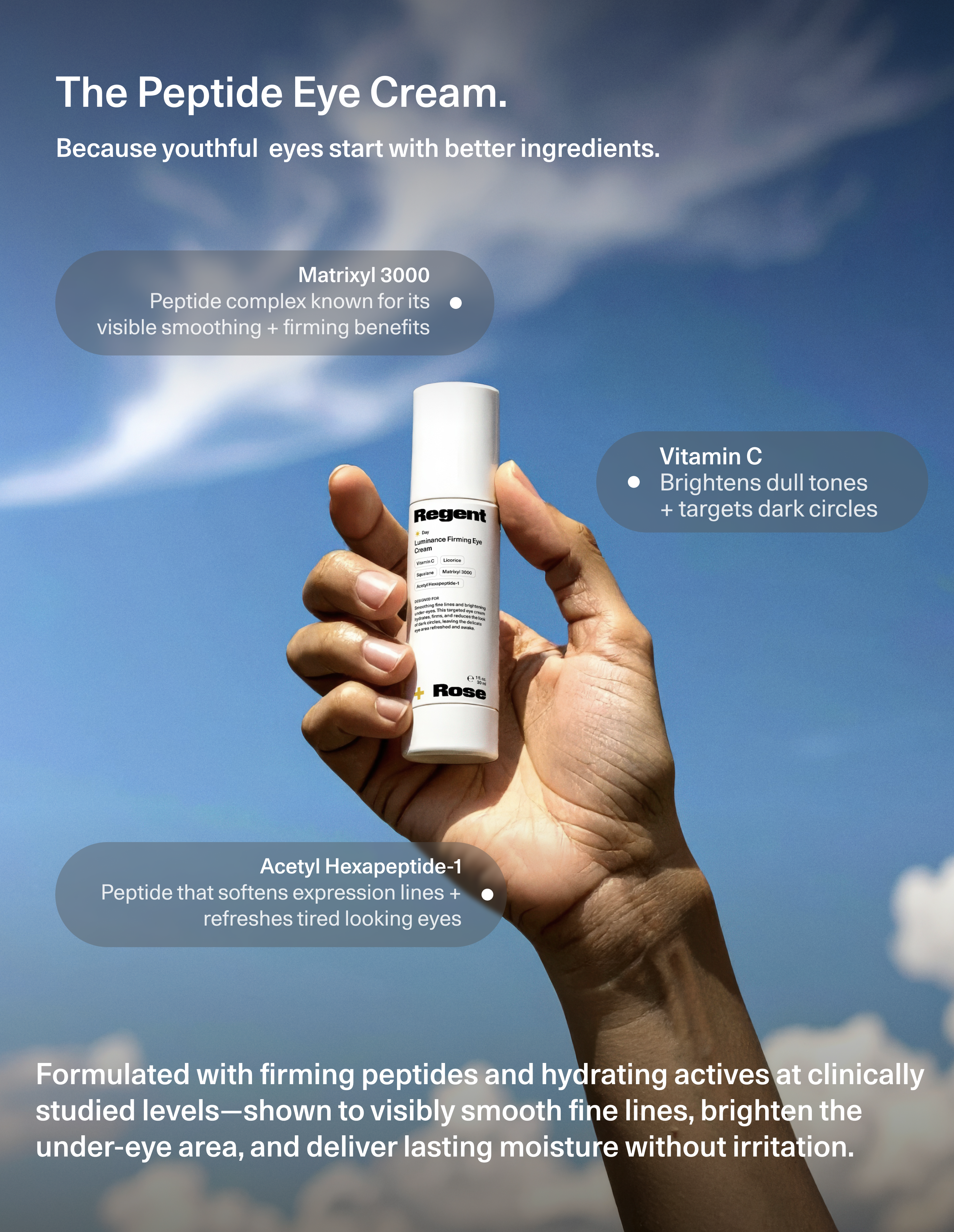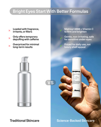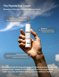 Peptides, Vitamin C, and brightening botanicals work in harmony to visibly firm, hydrate, and illuminate the under-eye area.